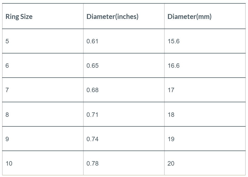 You now have the circumference of your ring, use the following chart to determine your ring size.